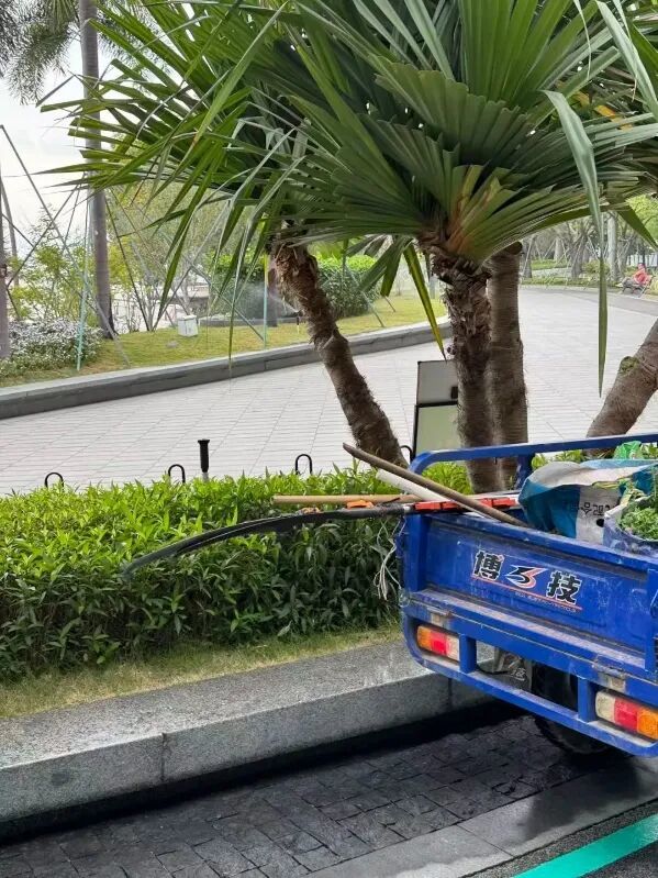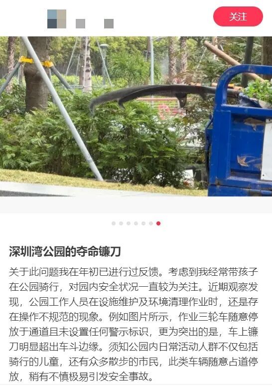 该网友称,因为经常带孩子在公园骑行,其对公园安全状况尤为关注。据其近期观察,公园作业人员在开展工作时,作业三轮车停放在通行通道上,且未设置任何安全警示标识,稍有疏忽便可能引发碰撞等安全事故。此外,作业车上装载的镰刀等工具,部分长度已超出车身边缘,外露的锋利工具也存在安全隐患。该网友拍摄的现场照片也清晰显示,车上镰刀等作业工具确实存在超出车身长度的情况。